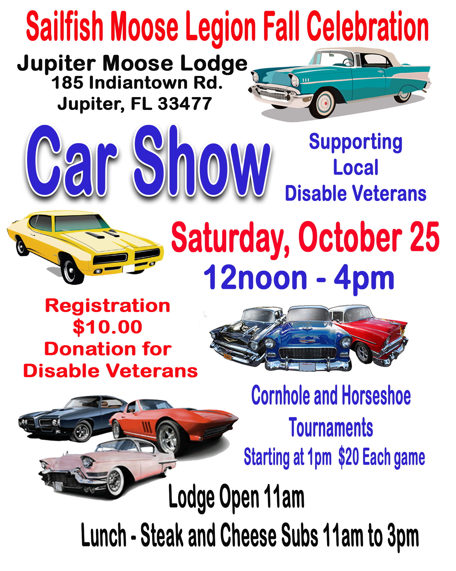 25, Saturday - [Open show] sailfish moose legion fall celebration [jupiter[: 12pm-4pm, Lodge opens @ 11am. $10 registration at the door. supporting local disabled veterans. location - jupiter moose lodge 185 indiantown road in Jupiter, FL 33477. Phone (561) 370-8661 flyer map show page